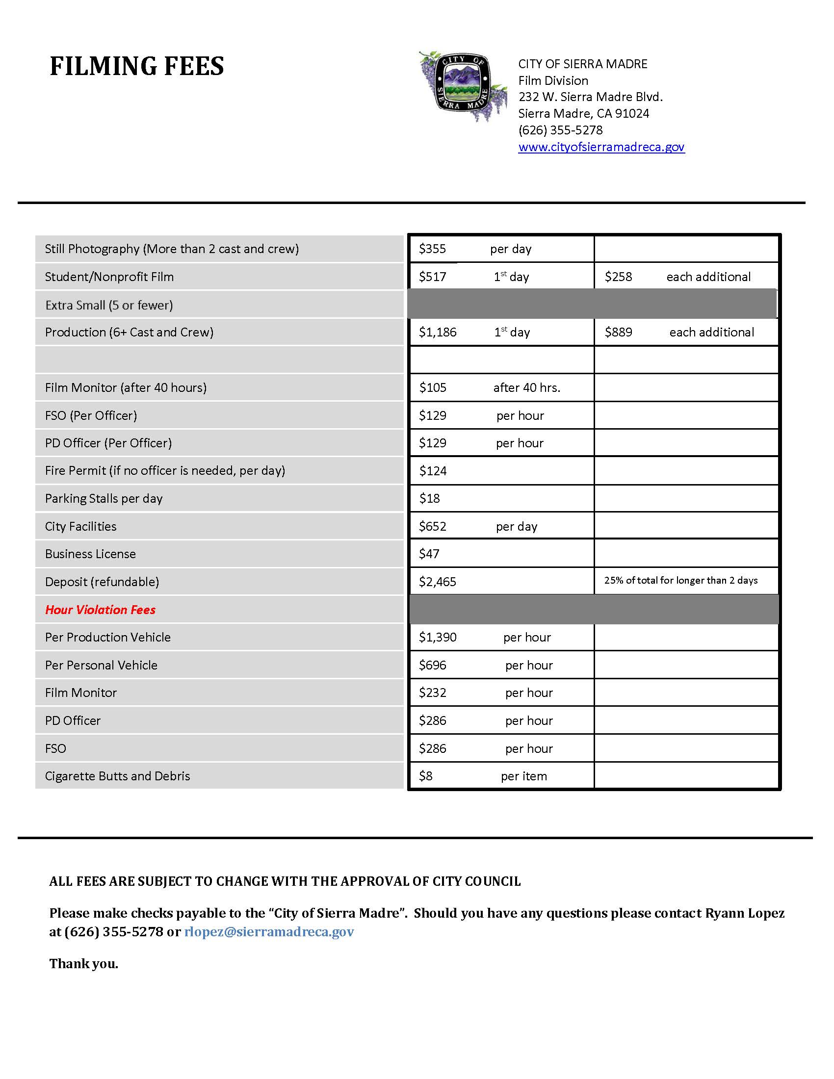 Call the City of Sierra Madre Film Coordinator for further assistance.